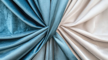 This image features an elegant fabric texture showcasing beautiful shades of blue and cream. The soft drapery creates a luxurious and artistic backdrop for various design applications.