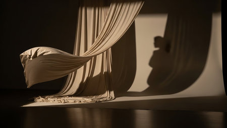 A dramatic and artistic composition featuring flowing beige fabric draped in a studio setting. Strong directional lighting creates deep shadows and highlights the texture and folds of the cloth. In the background, a soft silhouette of a person is visible, adding a sense of mystery and human presence to the abstract scene.