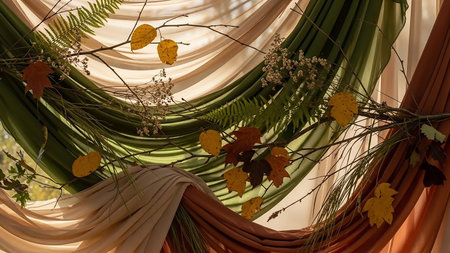 Autumn branches with colorful leaves and ferns are artfully draped over flowing, soft fabric in warm earthy tones.