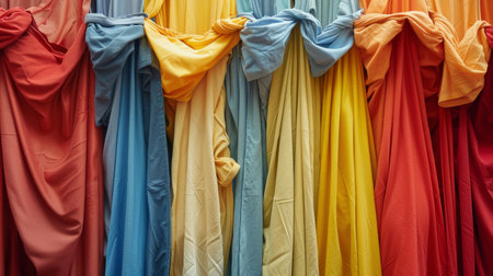 A striking arrangement of colorful draperies in a studio setting creates a vibrant background, showcasing rich textures and playful shades.