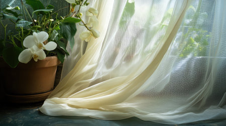 A beautiful scene featuring soft fabric draping alongside elegant flowers in a pot, illuminated by gentle, natural light filtering through a window.