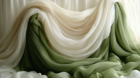 Silk layers of cream and green cascade elegantly, forming a tranquil and cozy setting.