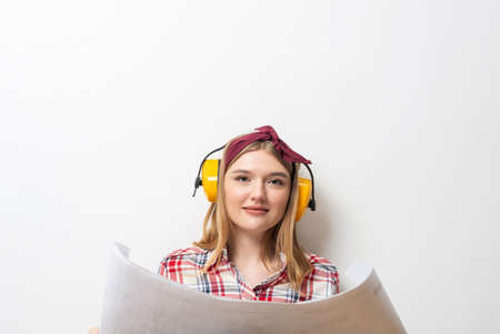Happy girl in protective headphones sitting on floor with paper blueprint. Home remodeling after moving concept with copy space. Young woman in checkered shirt and jeans planning to redesign her home.