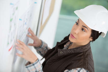 woman wearing a safety-helmet looking at a notice board