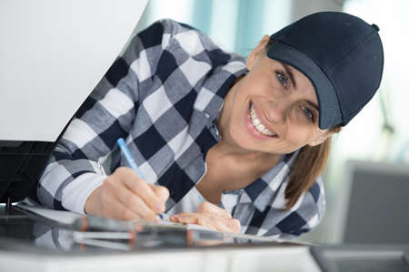 Portrait of woman handyman mechanic in workshop writing notes in notepad while repair furniture. Small business