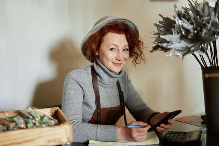 Florist woman in hat and leather apron sitting at the workplace in flower store and calculating profit or making accountant job. Calculation and planning concept. High quality image