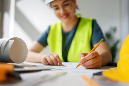 Woman architect is working on plans at construction site.