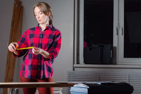 girl in a construction firm works with a tape measure