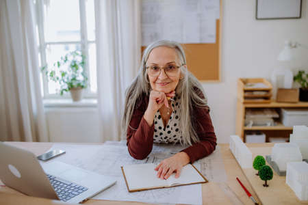 Mature woman architect with model of houses standing in office and looking at camera.