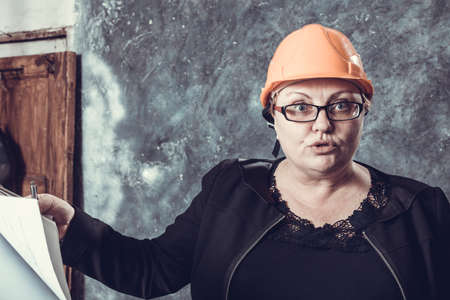 Businesswoman with documents in hands and a construction helmet on his head