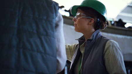 Livestock worker talking colleague at milking production parlour close up. Focused woman professional farm engineers discuss checking equipment in production facility. Agriculture specialist job.