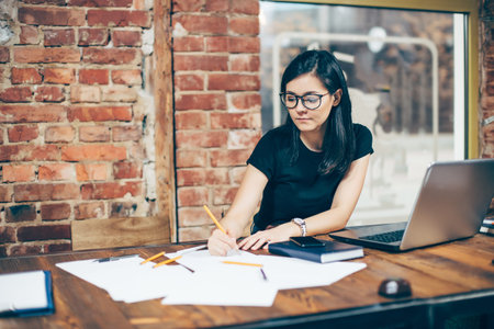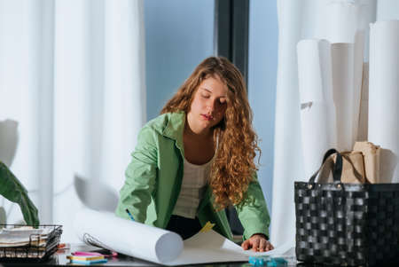 Young brunette woman working with drawings while sitting at desk in office