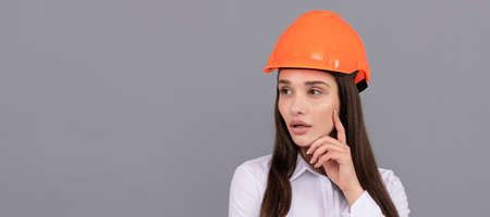 thoughtful woman in safety hardhat and white shirt on grey background, builder. Woman isolated face portrait, banner with mock up copy space.