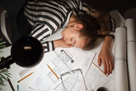 Close up of a business woman architect sleeping on her desk at the office, designing drafts