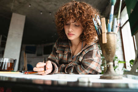 Young redhead woman artist drawing with pencil sitting at the desk with cup of tea in the studio workshop
