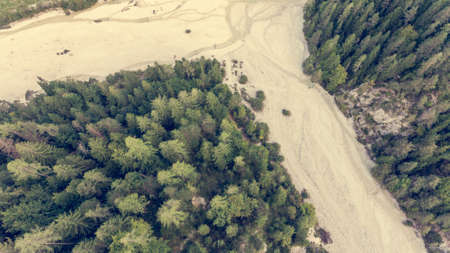 Aerial view of the sandy beach at the bend of the river
