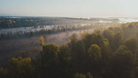 Top aerial view of the estuary of the river with green and yellow trees on the banks. Everything is covered in fog. A small kayak is floating on the water. Ukraine