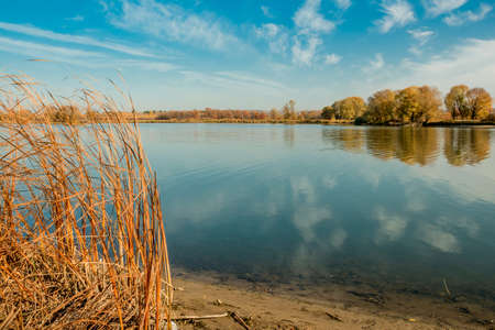 Autumn trees, reeds on the river bank on a sunny day. White clouds are reflected in the water.