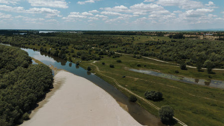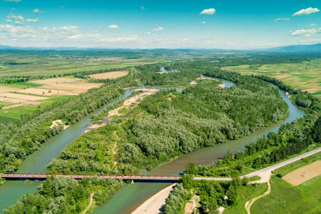 Aerial view of Danube river in Serbia. Beautiful nature image of Danube river.