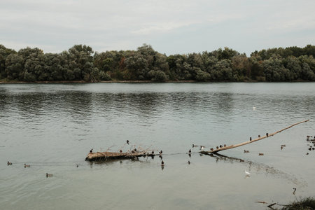 Ducks and birds rest on floating branches in the calm waters of the Danube River, Belgrade