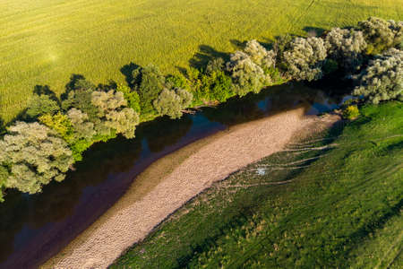 Aerial view of bright river flowing through green meadows in spring.