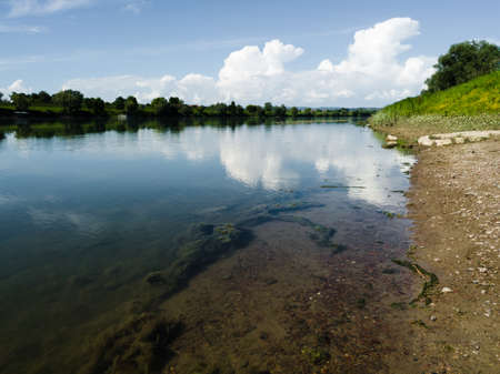 White bright cumulus clouds on blue sky. Landscape with river, grassy river bank and underwater freshwater algae