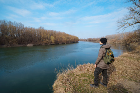 A teenage boy standing on the riverbank, an early spring landscape, the concept of hiking and outdoor activities