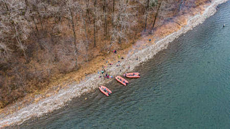 Aerial image of beautiful winter landscape offorest beside water with small boat in river