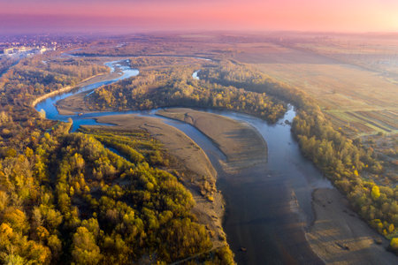 Aerial view of beautiful landscape with river and forest at sunset.