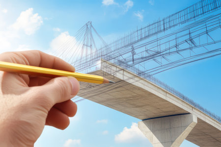 A creative hand uses a golden pencil to draw a bridge blueprint that transforms into real construction, symbolizing vision and engineering.