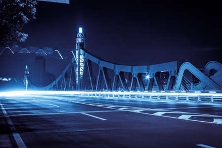 Advanced technology illuminates a bridge while vehicles move, showing connectivity and urban infrastructure.