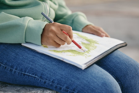 Closeup of female hand painting sketch on paper notebook with pencils. Woman artist at work