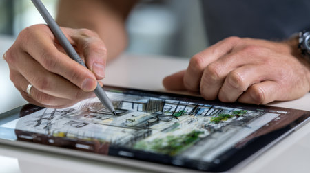 A man is drawing on a tablet with a stylus. The drawing is of a building with a lot of windows. The tablet is on a white table