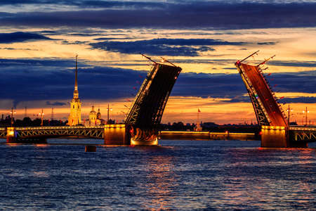 View through the opened bascule Palace Bridge and Neva river to Peter and Paul Fortress at white night time, St Petersburg, Russia