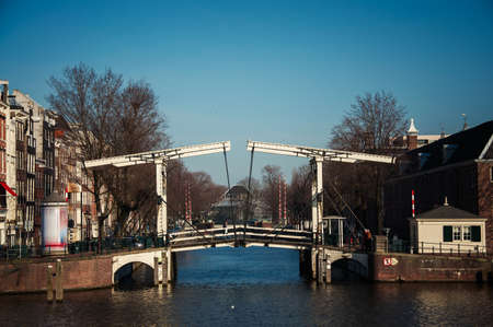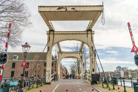 Amsterdam, Netherlands - March 2020: Magere Brug or Skinny Bridge on Amstel river, bascule bridge made of white-painted wood.