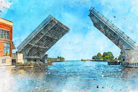 Digitally created watercolor painting of the Alpena drawbridge raised to allow traffic through on the Thunder Bay river