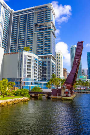 Miami, Florida - August 16, 2017: Scenic Miami River cityscape with yachts and open Northwest Fifth Street drawbridge.