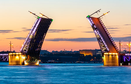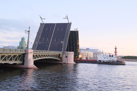 Landscape with the image of open Palace bridge from the Neva river in St. Petersburg, Russia,