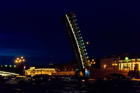 Night view on illumunated open Palace Bridge and Neva River, St. Petersburg, Russia