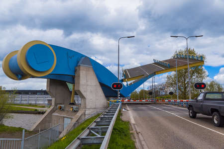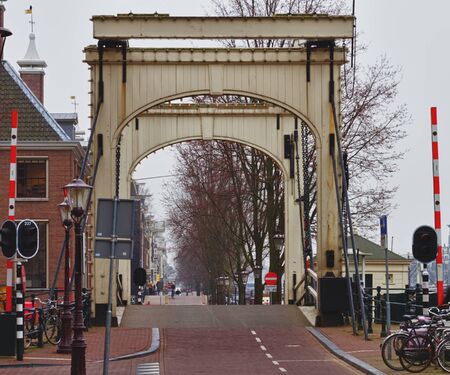 Drawbridge or bascule bridge on canal with metal mechanism side view in cloudy day - Amsterdam, Netherlands