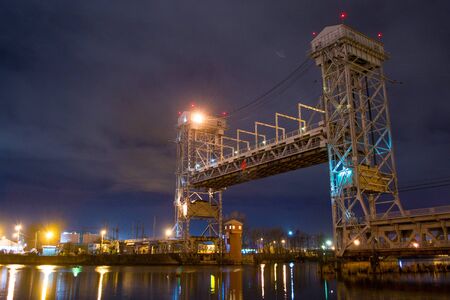 Raised double-deck drawbridge over the Pregolya River in Kaliningrad, Russia.