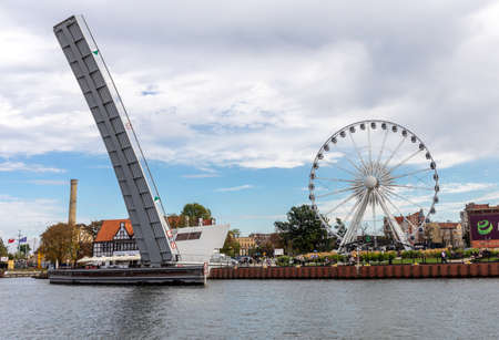 Gdansk, Poland - Sept 9, 2020: The Draw Footbridge over the Motława River and Ferris wheel on the Olowianka Island in Gdansk