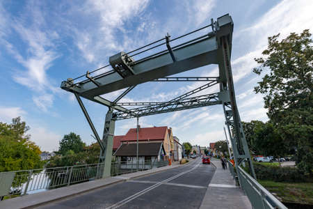 Nowy Dwor Gdanski, Pomorskie / Poland - September, 22, 2020: A drawbridge in a small town in Pomerania. Passage for cars on the Tuga River. Autumn season.