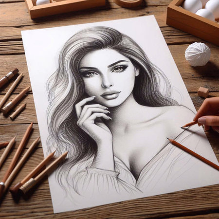 Drawing portrait of beautiful young woman with long hair on wooden table