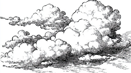 Beautiful dashed hand draw clouds in the sky. Linear background. Pen and ink renaissance book etching / engraving style illustration. Line art with lights and shadows.