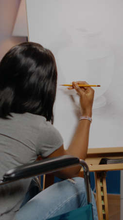 Artist of african american ethnicity with disability creating vase design on canvas using art pencil while sitting in workshop room at home. Black woman in wheelchair drawing masterpiece