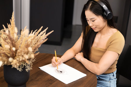 Asian Woman Is Painting With Pencil In Headphones