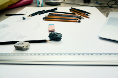 Top view of male artist working with blank sketch paper, pencils, camera and supplies on worktable