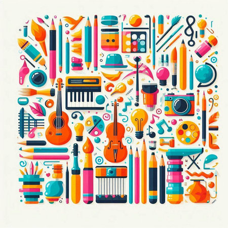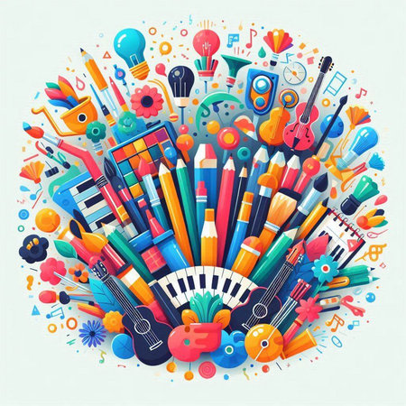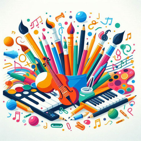 This vibrant flat lay image showcases musical instruments like a saxophone and violin, surrounded by colorful art supplies and notes. Perfect for creative projects.