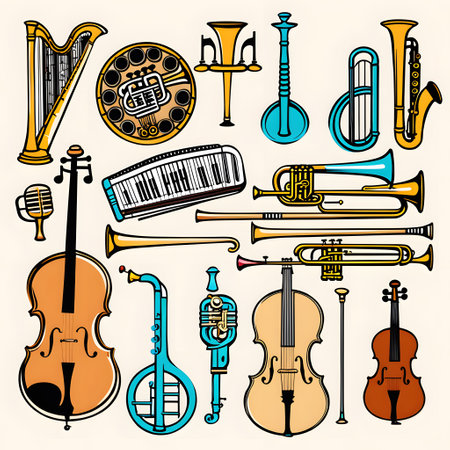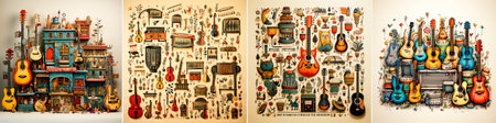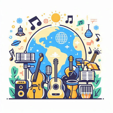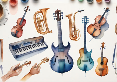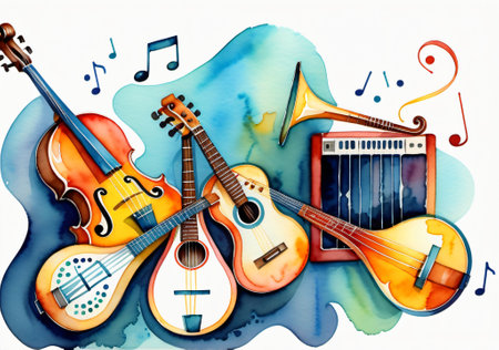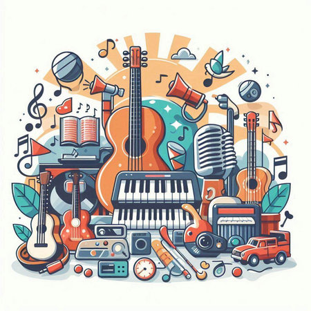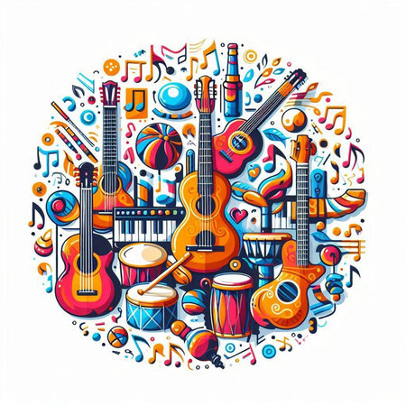 This vibrant image showcases a collection of musical instruments, including a guitar, saxophone, and drums, set against a colorful background. Perfect for artistic projects.